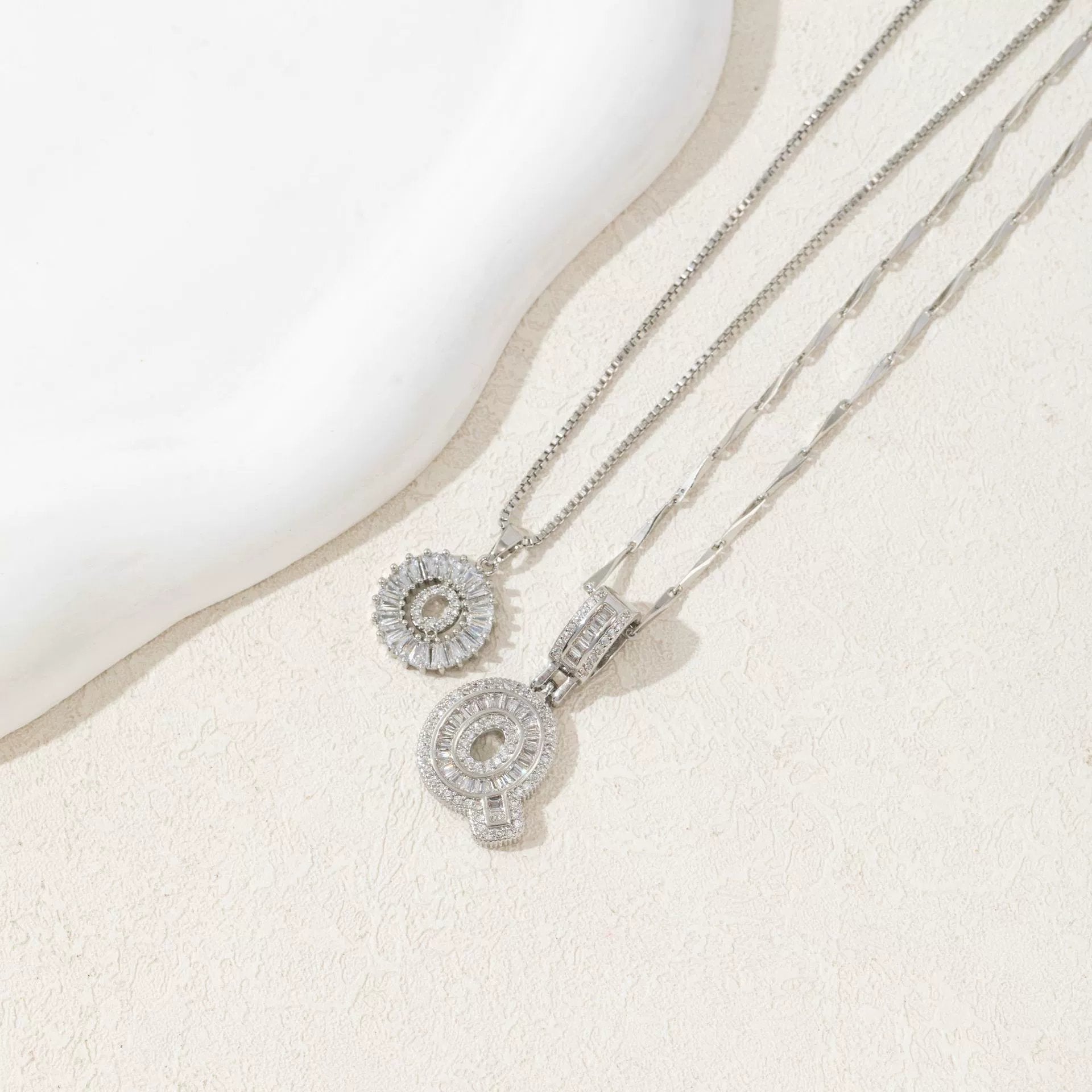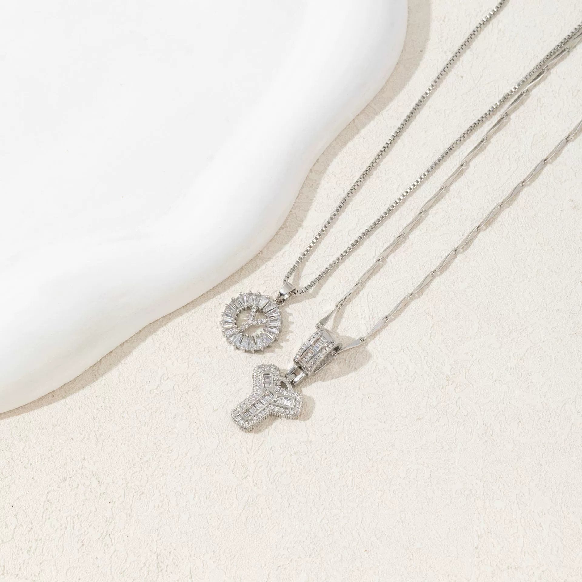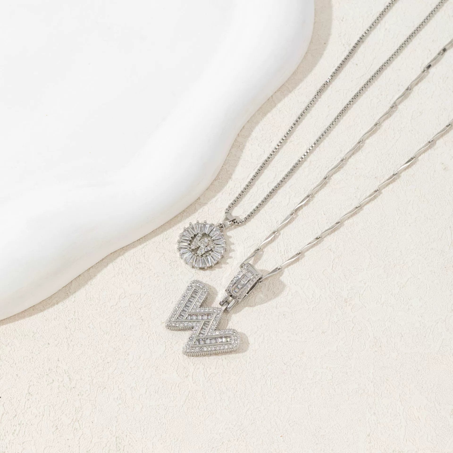- Shorter Necklace: A dainty gold box chain with a baguette diamond circle pendant. At the center sits a delicate paved diamond initial, adding a subtle yet luxurious touch.