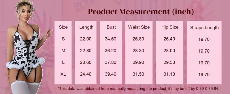 Features: This three piece lingerie set includes a cow print halter bodysuit, furry trim details, and stockings for a fun, flirty look
