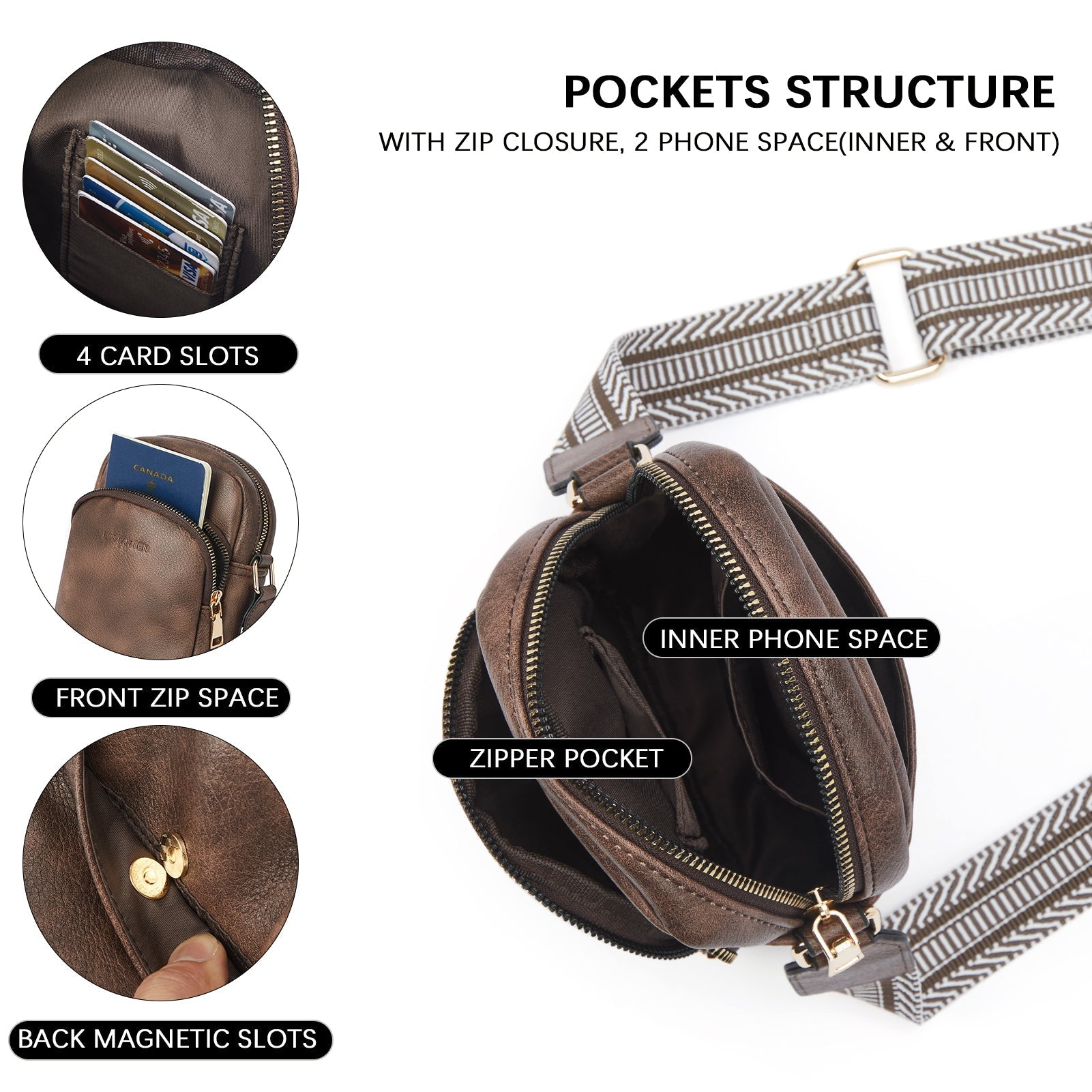 - 【Small but Functional Crossbody Bag】Special triple compartment design--Front Zipper Pocket (For passport or 6.1" phone) + Middle Main Zip Pocket + Back Slip Slot (magnetic-snap). Inside has 5 Card Slots + Phone slip slot. Meaning you can make storage easier & safer, More spaces which is convenient to allocating specific space for certain products.