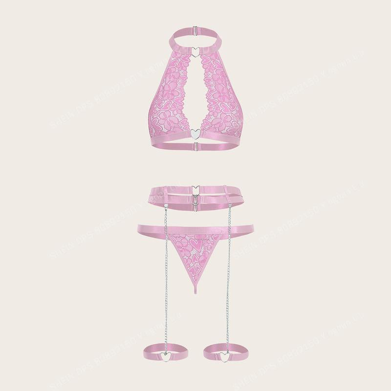 Lingerie Sets 5 Piece Lace Ring Linked Halter Bra and Panty Garter Belts Set