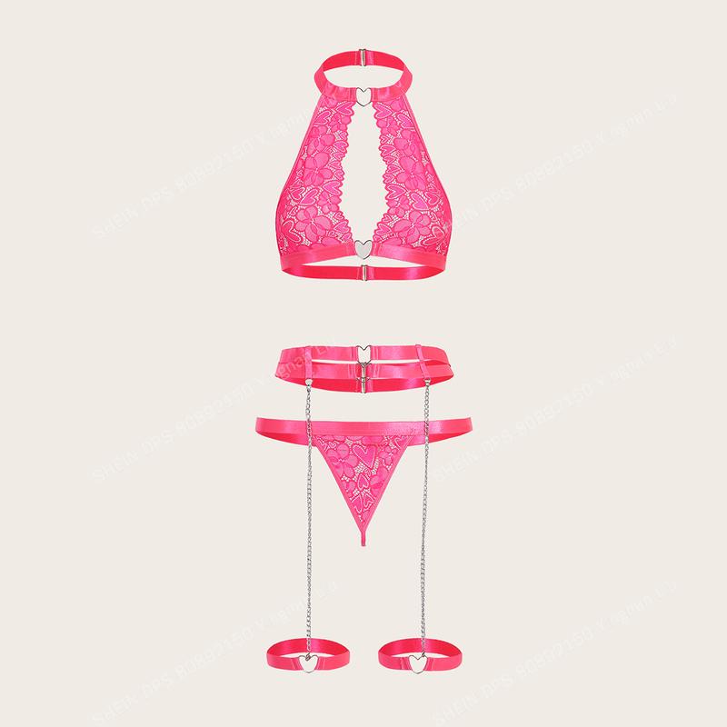 Feature: Lace, cut out, halter, ring linked, thongs, mid rise, womens lingerie, fashionable