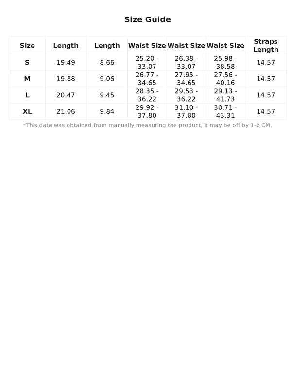 XL:Length:21.1IN,Straps Length:14.6IN,Waist Size:29.9-37.8IN,Waist Size:31.1-37.8IN,Length:9.8IN,Waist Size:30.7-43.3IN