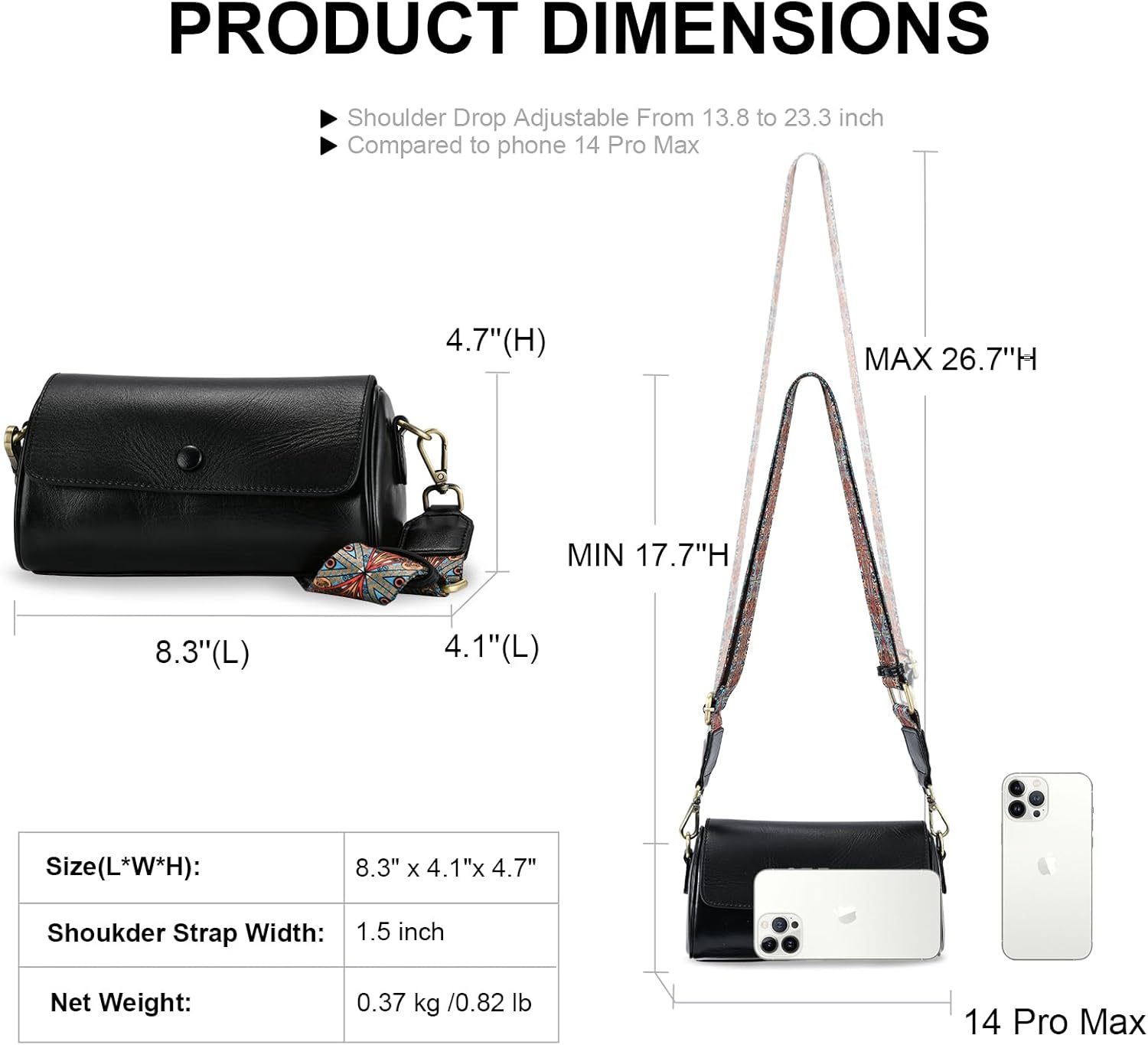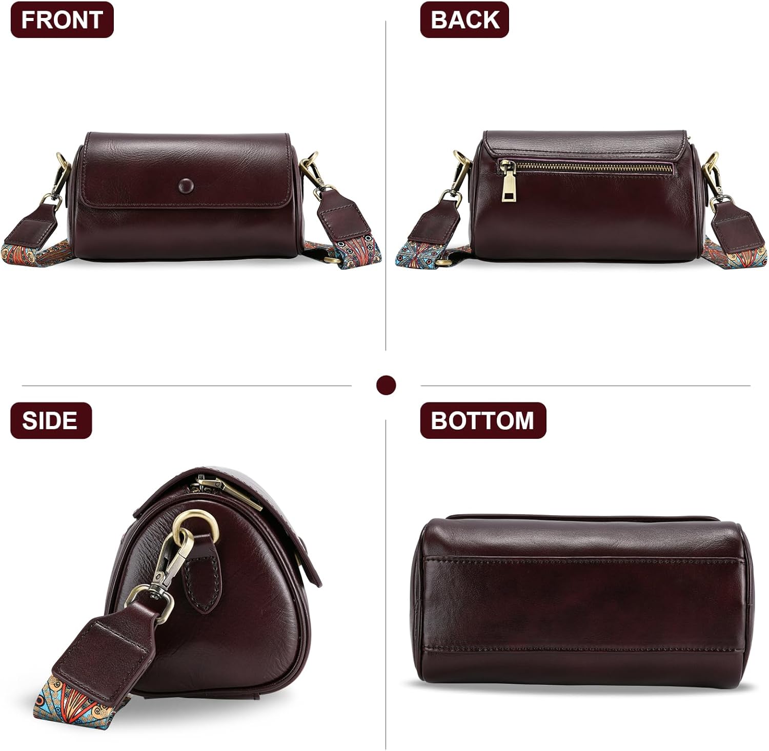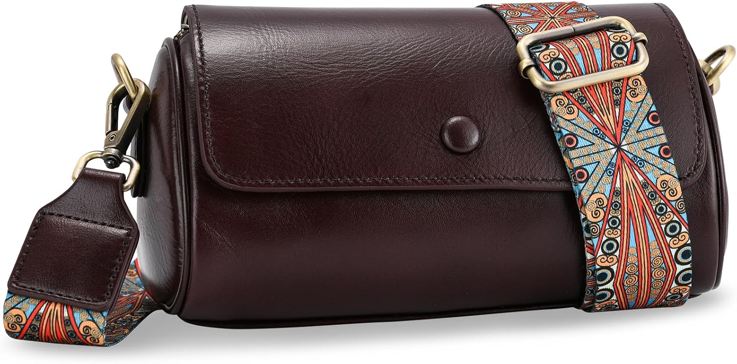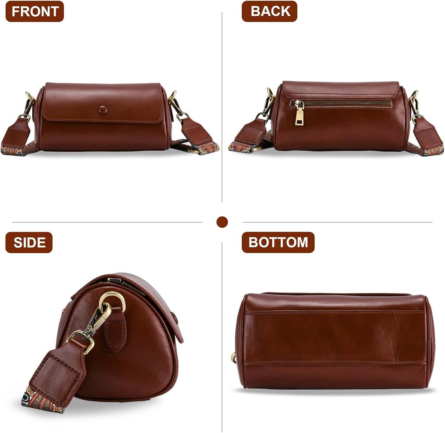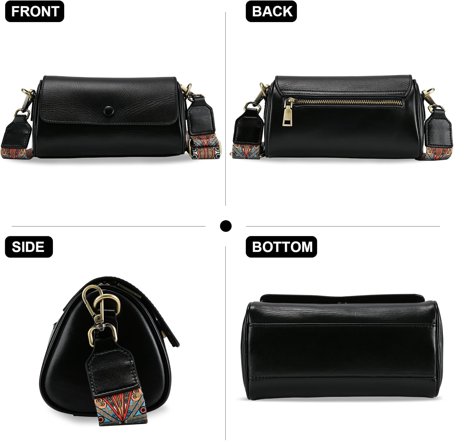 Unique Design: With its distinctive round flap and embossed button closure, it adds an artistic touch to the clean, cylindrical silhouette that is as functional as it is fashionable.