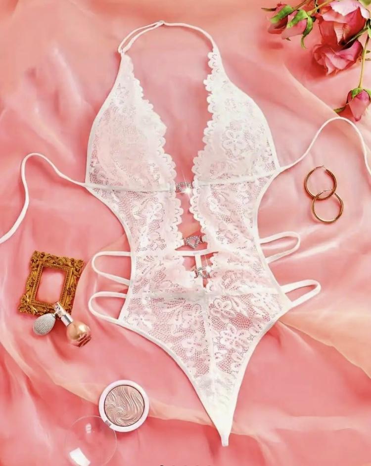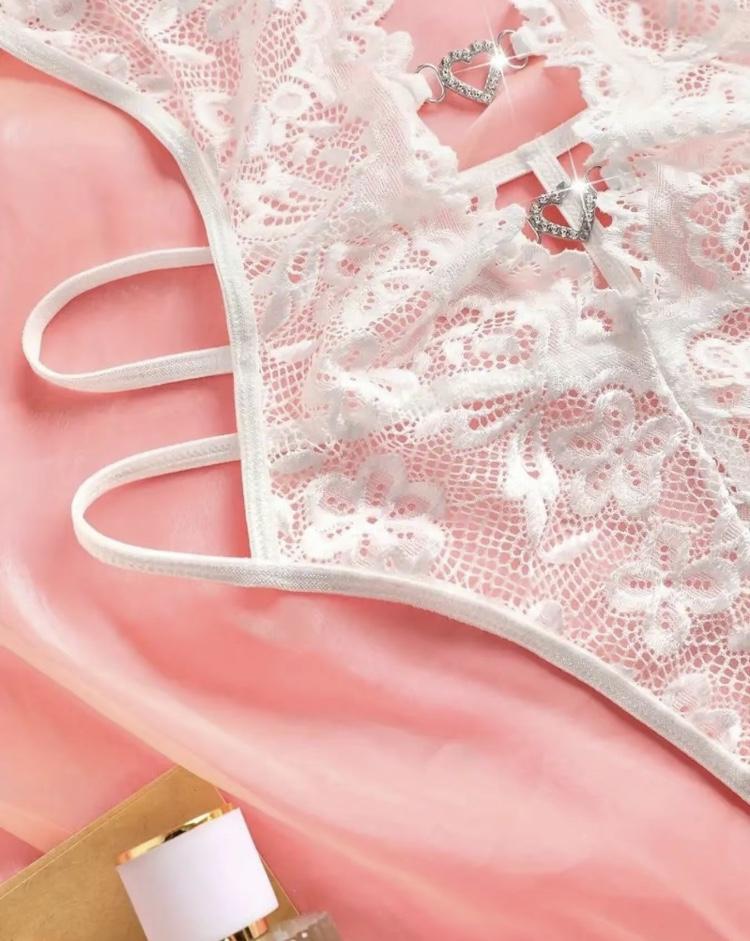 🌸Intricate Lace Cutouts: Sheer lace panels with floral motifs create a flirty yet sophisticated look, blending delicate coverage with artful allure.