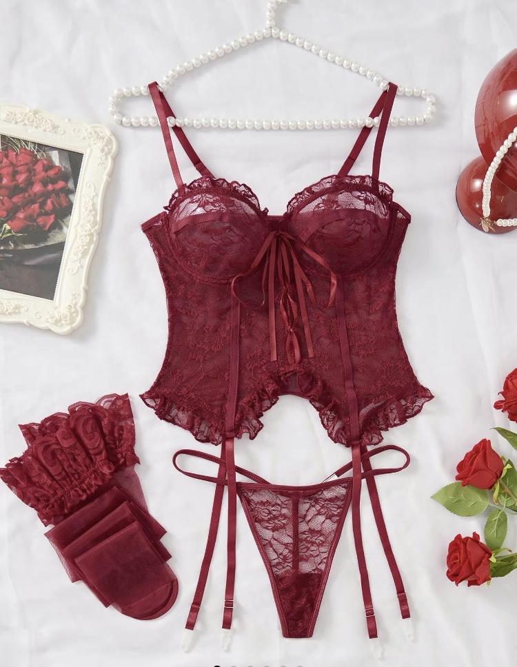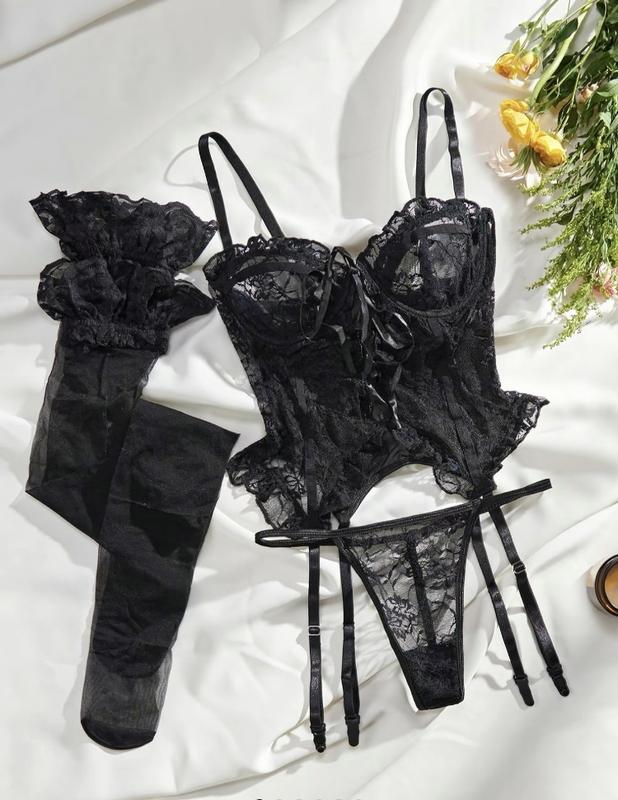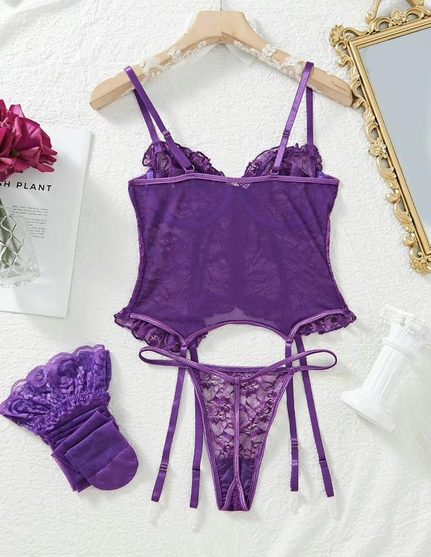 Material: Women's lingerie set with garter is made of soft floral lace, nylon and mesh.Comfortable, stretchy, breathable and durable.