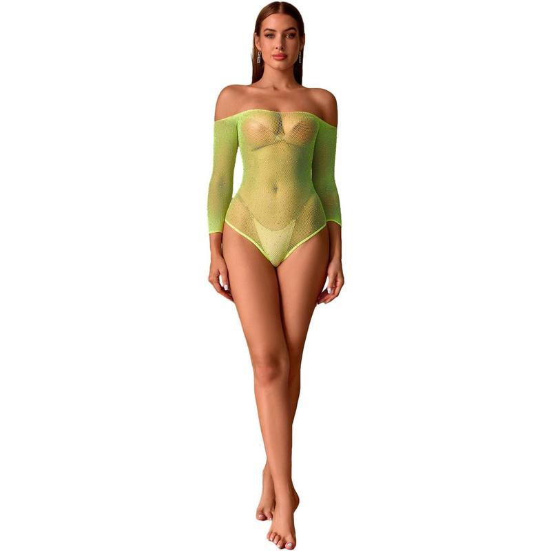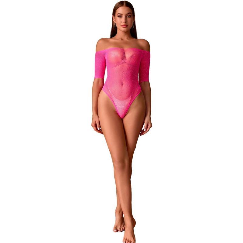 Women Lingerie Fishnet Bodysuit Sparkle Rhinestone Mesh Teddy Lingerie One Size Womenswear Basic Fabric Formal