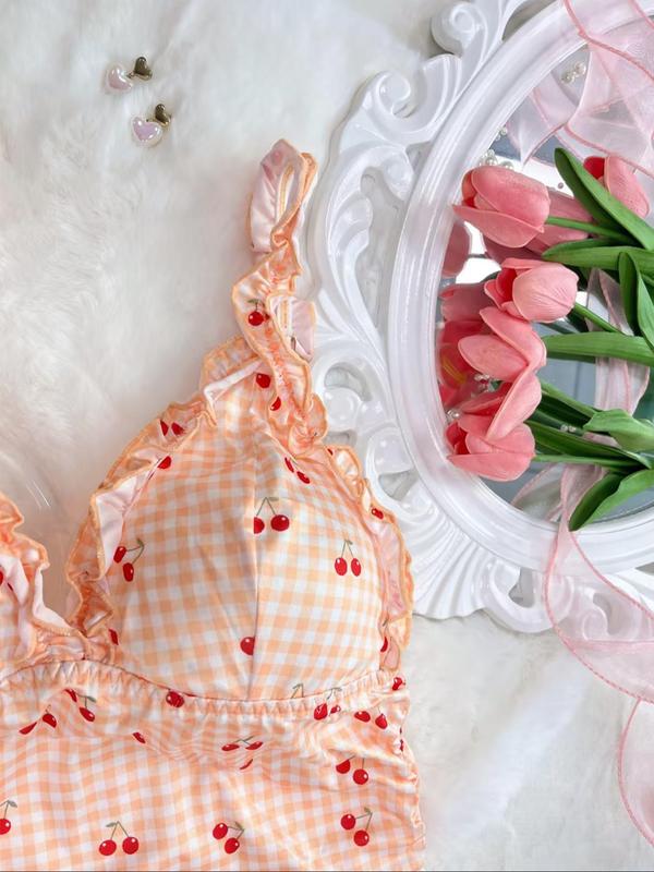 Women's Gingham & Cherry Print Frill Trim Ruched Ruffle Hem Cami Nightdress, Casual Soft Comfortable V Neck Backless Nightgown for Summer, Fashion Ladies' Sleepwear for Daily Wear